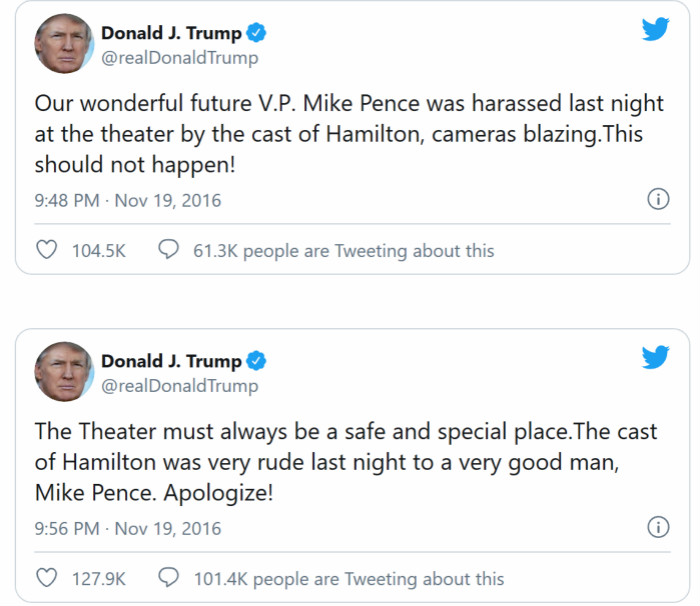 面对演员们的公开信,彭斯似乎并没有感到被冒犯,他微笑着走出了剧院。但特朗普非常不满,在第二天连续发推指责剧组“粗鲁的骚扰行为”,要求他们道歉。Dixon也很快在推特上回复道:“先生,对话并不是骚扰。我很感激彭斯先生能停下来听我说。”