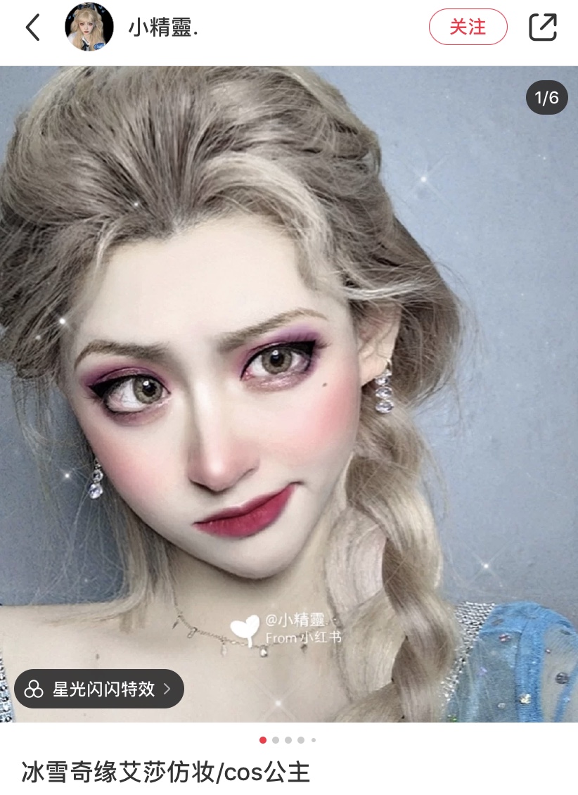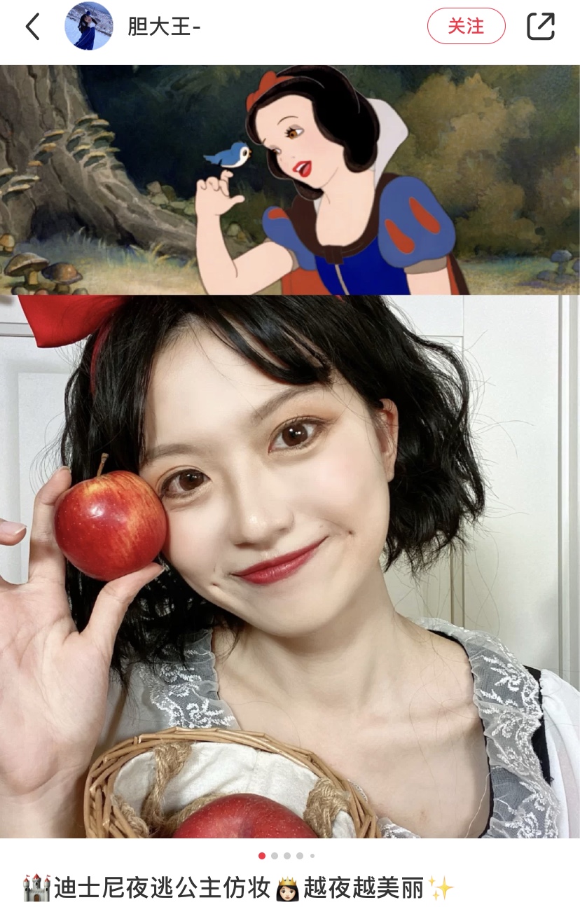 国内也有很多仿妆高手在把自己扮成迪士尼公主,在生活方式平台小红书上,与“迪士尼在逃公主妆”相关的笔记超过了1万篇,与“迪士尼公主仿妆”相关的笔记则超过了4200篇。