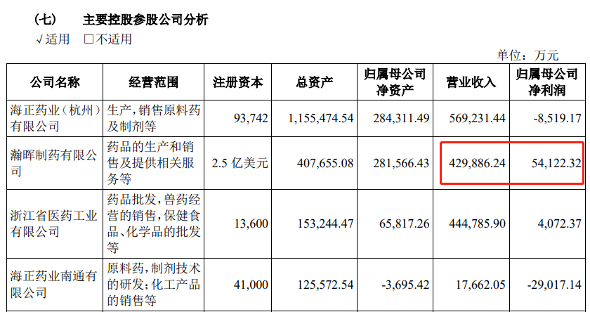 瀚晖药是公司的控股子公司,根据2019年年报披露,瀚晖制药实现收入42.99亿元,实现归母净利润5.41亿元。2019年海正药业的收入规模为108.07亿元,归母净利润9307.27万元。瀚晖制药对于海正药业业绩贡献的重要性不言而喻。
