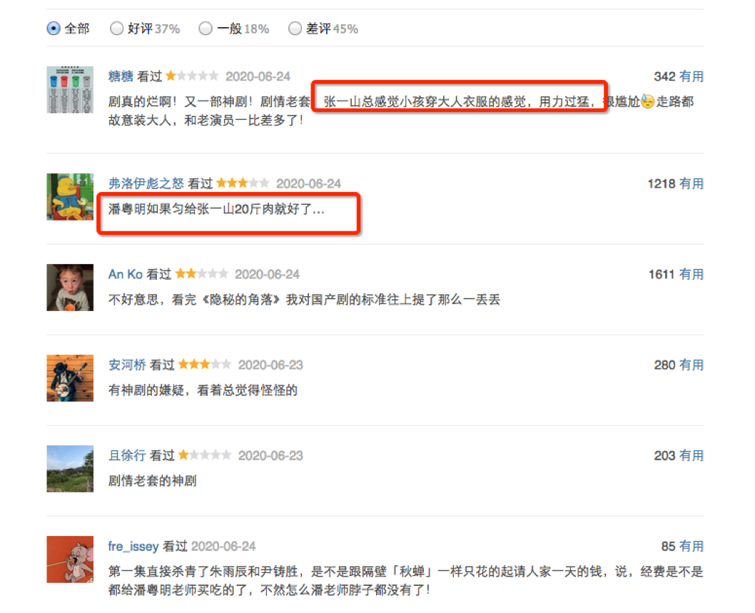 以豆瓣的短评为例,除了剧情、人设等讨论之外,更多的将焦点对准了“张一山”,对他在这部剧的表现差评不少——甚至可以这样说,作为一个年轻的“老艺术家”,张一山因为这部剧让其口碑下滑不少。