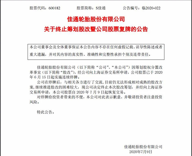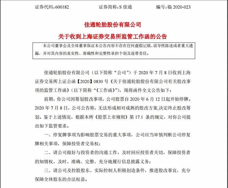 7月9日,《S佳通关于终止筹划股改暨公司股票复牌的公告》发布之后,随即引来了上交所的监管函。事实上,股民都不必费心打开看,除了日期改了下,内容几乎是“如出一辙”,难怪小股东会质疑此番策划股改为缓兵之计。