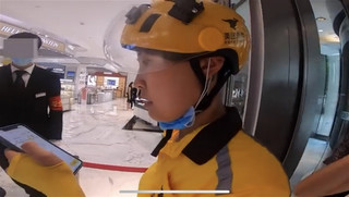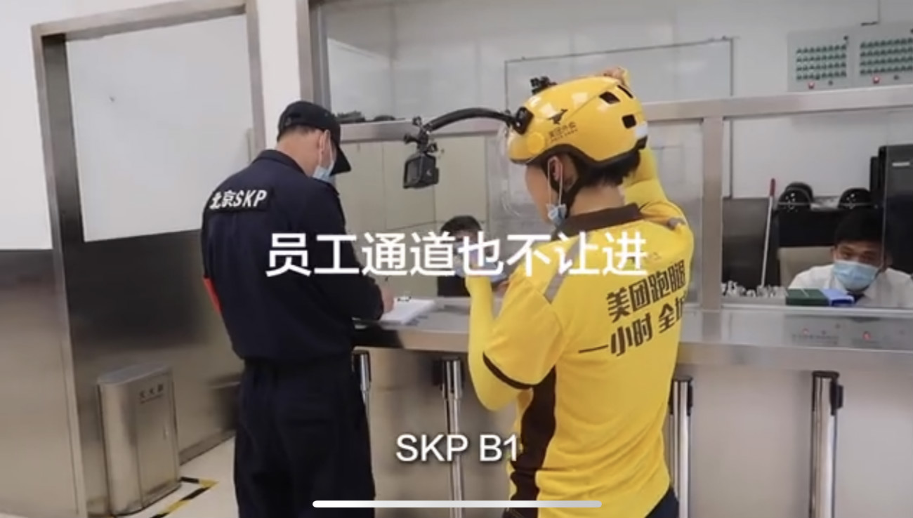 在视频中,SKP的保安明确表示穿着“美团骑手”服装不能进入商场,想要进入只有将衣服换掉,或"套件外套进入”。这种阻碍导致曹导陷入了取餐超时的绝望中,引发了公众对于外卖行业的共情。
