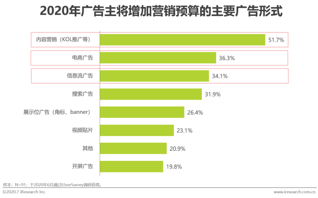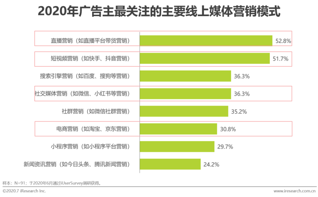 就艾瑞于2020年6月对广告主的调研数据来看,广告主在未来一年间将增加营销预算的广告类型主要有内容营销(KOL推广等)、电商广告和信息流广告,而以KOL为主体开展的新媒体营销模式也主要包含在以上三类广告形式中。同时,主要依靠KOL开展的直播营销、短视频营销、社交媒体营销等新媒体营销模式则是当前广告主们最关注的方向,其中,KOL参与度相对最高的直播营销和短视频营销分别以52.8%和51.7%的选择率成为半数以上广告主最关注的核心营销模式,在未来,KOL和新媒体营销也将成为广告主越来越重要的营销预算投入对象。