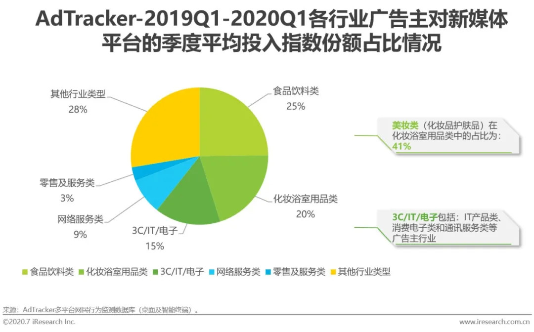 根据艾瑞AdTracker监测数据显示,在2019年至2020年第一季度间,每个季度中约70%选择新媒体平台开展营销投放的广告主,其所属行业主要集中在快消、美妆、3C/IT/电子、网络服务、零售等领域,行业投放集中度高。而欧莱雅集团、雅诗兰黛等美妆领域企业,阿里、京东等网服领域企业,以及华为、美的等3C/IT/电子领域企业,对新媒体营销有着较高的投入,从需求端推动新媒体营销的发展。