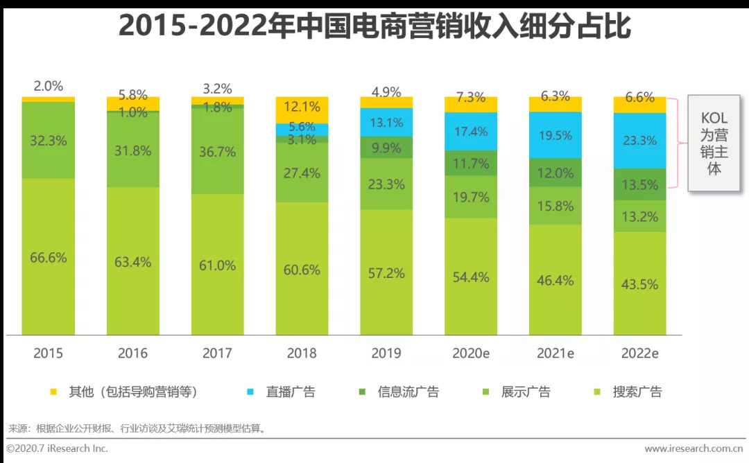 随着各类平台内容化建设的加强,各式非“硬广”营销模式开始出现。通过推荐、测评、分享等的新式营销模式,并借助贴合消费者内容获取习惯与偏好的图文、短视频和直播等形式,KOL作为传播营销内容的主体,正不断提升着对消费者消费行为和习惯的引导力。以电商平台上各营销方式所获收入的占比情况来看,以KOL为主体而开展的直播、短视频信息流和图文信息流广告等自出现以来快速扩张着收入份额占比,在2019年已占到电商营销收入的23%,重要性进一步凸显。