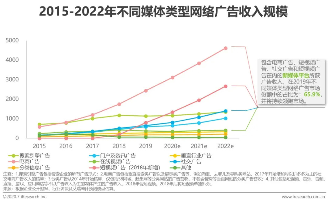 以KOL为主体的新媒体营销因更注重人的表达,从而推动着能够以人为主体,通过图文、视频、直播等形式来为品牌或商品进行营销展示的电商平台、短视频平台、社交平台和在线视频平台等成为新媒体营销的主要承载方。随着2018年电商平台直播广告开始变现并迅速获得市场关注,同时短视频广告规模增长开始步入爆发期,新媒体平台广告规模持续扩张,2019年已占不同媒体类型网络广告收入规模的65.9%,预计在2022年,该占比将超过75%,新媒体平台将成为广告主越来越重要的营销投放对象。