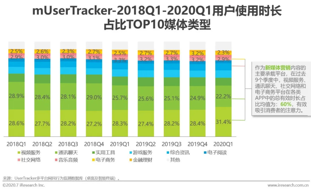 随着内容展现形式的逐渐多元化与消费者对内容化要求的提升,新媒体平台凭借着其内容化强且表达形式多样的优势,使得消费者的互联网日常使用习惯不断向新媒体平台转移。根据艾瑞数据监测产品mUserTracker对各类型媒体的用户使用时长监测结果所示,视频服务、通讯聊天、社交网络和电子商务等新媒体营销重点开展类别平台,在使用时长TOP10的媒体类型中占据4位。并且,在2018Q1-2020Q1期间,该4类媒体类型平台在所有媒体平台中的季度总有效使用时长总和占比维持在60%左右,在注意力碎片化的时代中,新媒体平台脱颖而出,稳定保持着对消费者的较高吸引力。