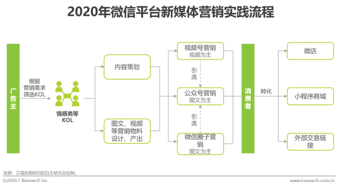 因微信平台用户已对公众号频道的长篇图文形式形成阅读习惯,借助KOL所撰写的图文来对品牌或商品开展深度营销成为微信平台的新媒体营销特征之一。另外,微信逐步打造的内容频道也为KOL提供了越来越多的营销玩法展示可能,例如KOL可借助图文形式在具有兴趣小组特征的微信圈子中瞄准具有相关兴趣的消费者进行商品推荐;同时,KOL也可以在微信视频号中以短视频的形式向消费者传递信息量更大的营销内容。在转化方面,微信在微店和跳转外部链接的功能上,小程序功能还能够帮助KOL和品牌引导消费者直接跳转小程序商城进行购买,使营销内容的转化流程更为便捷。