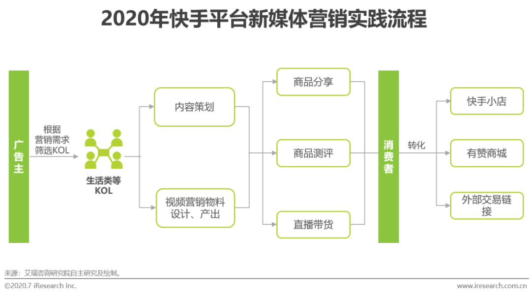 快手平台上有着较多具有真实感的生活类KOL,粉丝对其的信任感强,KOL进而能够更有效地通过视频或直播推荐的形式带动商品的售出。快手平台的新媒体营销玩法同样是围绕着KOL开展短视频商品分享、测评,以及直播带货为主,特点在于KOL的推荐或售货形式更为“接地气”,与消费者间的联系更为直接,并且具有较高的粉丝带动力。另外,快手平台除了自身的快手小店外,还通过联合有赞商城、跳转外部电商等形式,为KOL开辟出更多营销对接可能性。