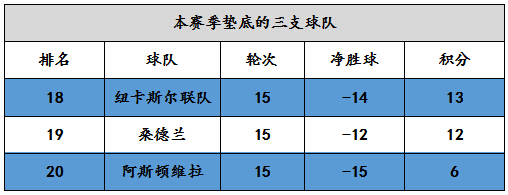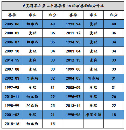 本赛季切尔西开局的糟糕表现刷新了英超卫冕冠军联赛开局的下限。事实上,除他们之外,只有布莱克本以卫冕冠军的身份,在第二个赛季前15场比赛中拿到低于20分的成绩。在这份榜单中,切尔西和曼联占据了前两名的位置,他们分别在2005-06赛季和1993-94赛季拿到了40个联赛积分。