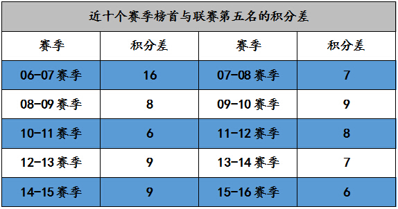 客观地讲,这一现象十分罕见。联赛排名榜首的莱斯特城同排在第五位的托特纳姆热刺间只有6分差距。在过去十年的时间里,这样接近的差距只出现过一次。