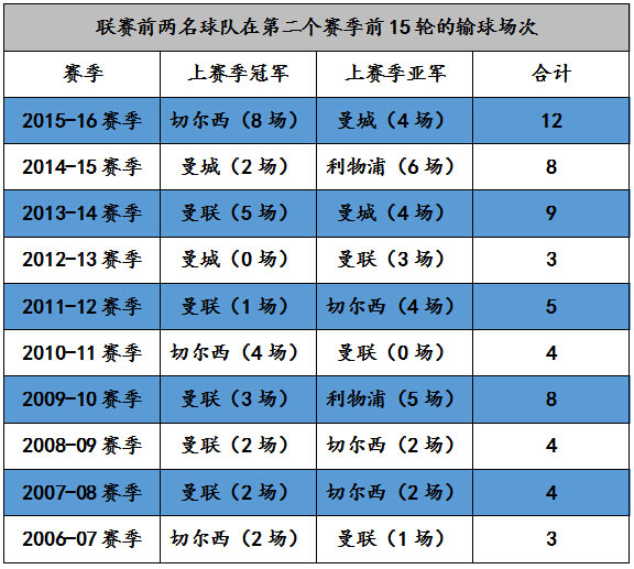 上赛季位列前两名的切尔西和曼联本赛季已经累计输掉了12场比赛——这一数字在过去十年里无人能出其右。