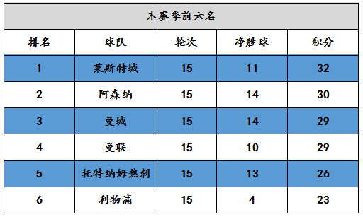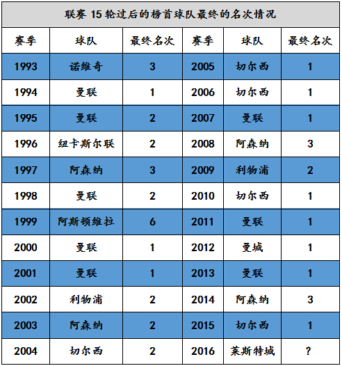 曼联有八次在十五轮联赛结束后名列榜首,而在这八次中,他们有六次赢得了联赛冠军。但是在所有出现在上述这份榜单的球队里,只有三支球队在当赛季最终登上了冠军领奖台,分别是曼联、曼城和切尔西。