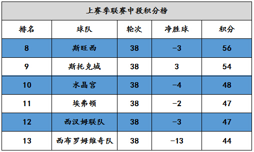 本赛季的排名与上赛季看起来是如此接近。本赛季位列中游的六支球队有四支在上赛季也处在相似的位置。