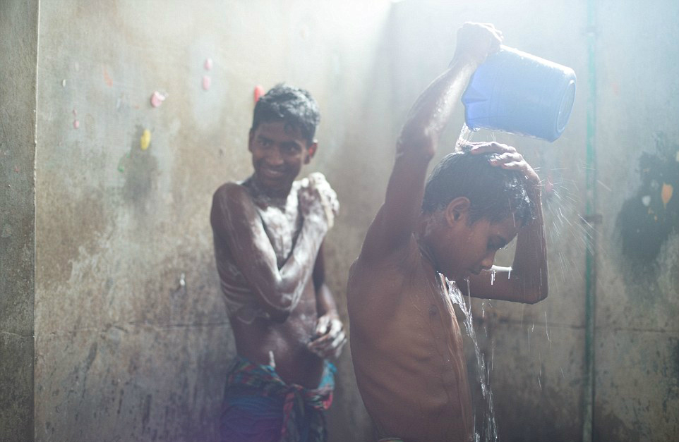 联合国儿童基金会(UNICEF)的数据显示,孟加拉国有约100万10至14岁的童工,如果将年龄范围扩大,人数更是多得可怕。投身工作让他们有能力勉强维持生活,要是不做童工,或许会沦落至风餐露宿的地步。Casillas镜头下就有这么一张照片,男孩们正在厂房里洗澡,工厂繁重的工作量让他们不得不就在这里吃饭、洗澡和睡觉。