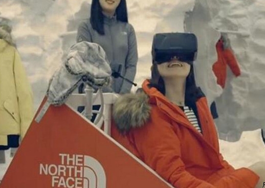 The North Face今年还在宣传中加入了大热的虚拟现实创意。科技公司Jaunt为其拍摄的一则虚拟现实视频,展现了登山者从犹他州户外运动圣地Moab陡峭悬崖带着降落伞一跃而下的场景。而在韩国一个购物中心的专卖店,顾客可以带上虚拟现实头盔体验南极的冰天雪地。
