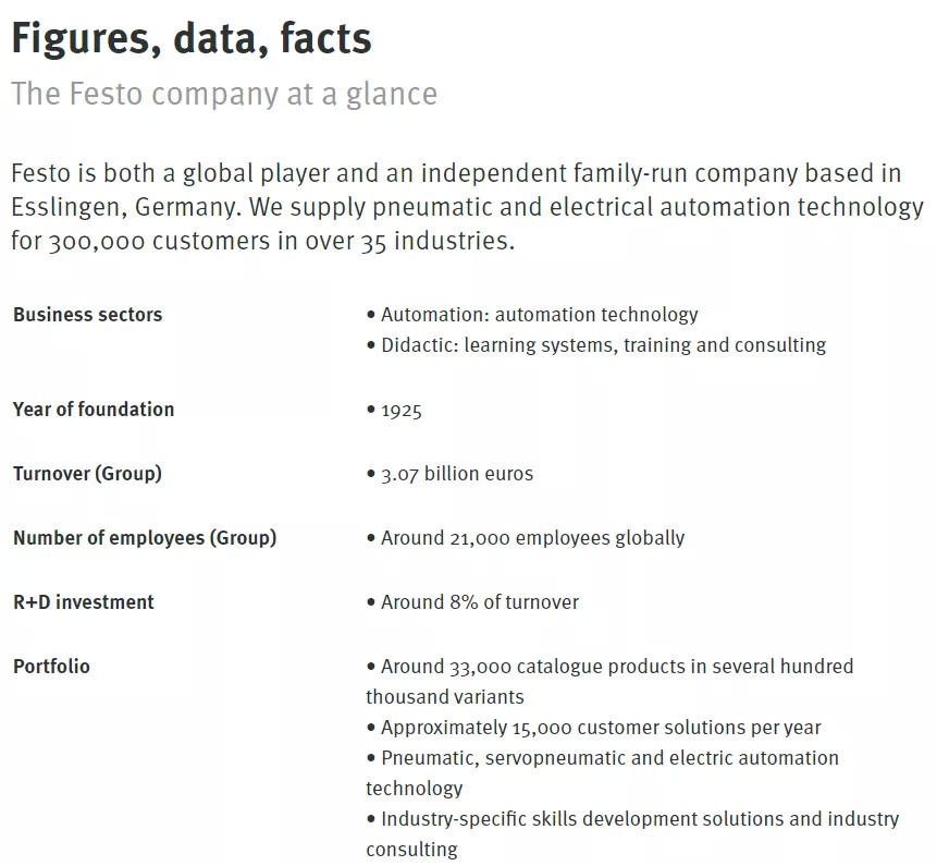 经过将近一个世纪的积累,Festo 已经成长为最著名的气动元件、组件和系统生产厂商,为超过 35 个行业的 30 万客户提供气动和电气自动化技术。此外,它还拥有了足够强大的现金流(营业额达 30 多亿欧元),几乎不受资本市场的影响。