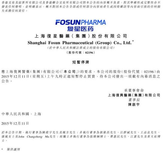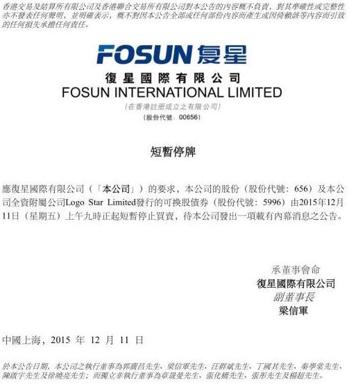 12月11日早间,在港交所上市的复星国际与复星医药先后公告停牌。其中复星国际公告称,公司股票与债券将于今天上午九时正起短暂停止买卖,与该公司有关的所有结构性产品亦将同时短暂停止买卖。其后上交所公告,复星医药、豫园商城、上海钢联、南钢股份、海南矿业均同时申请临时停牌。