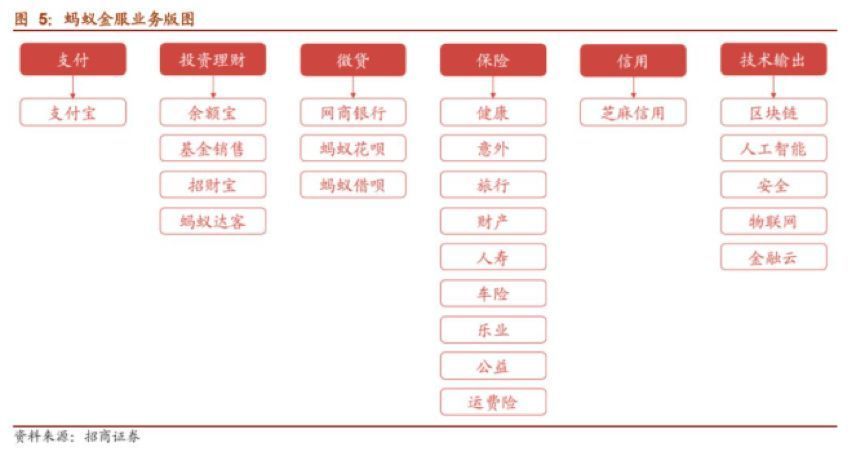 目前,蚂蚁集团旗下涵盖“支付、理财、微贷、保险、征信、技术输出”六大板块。