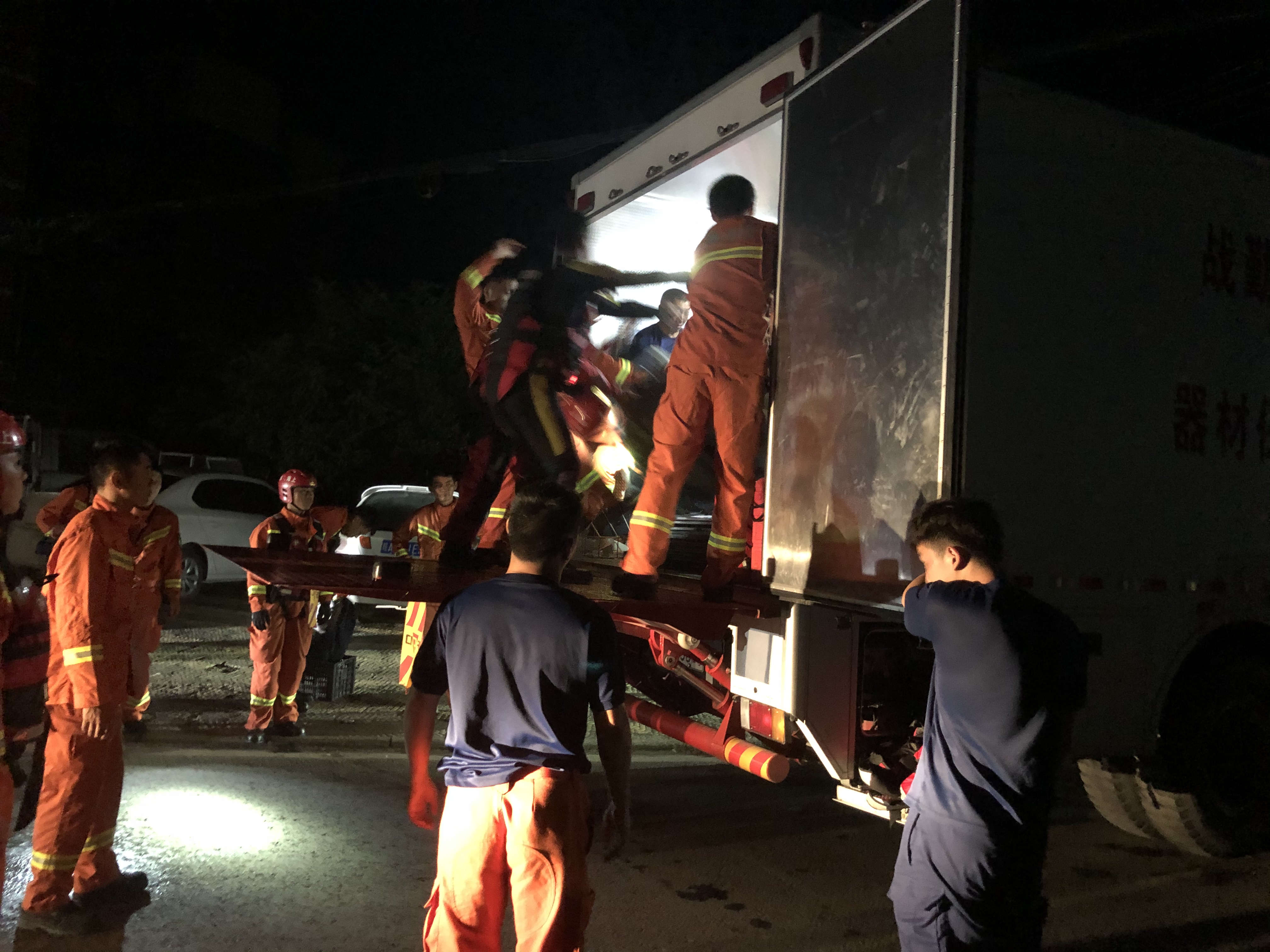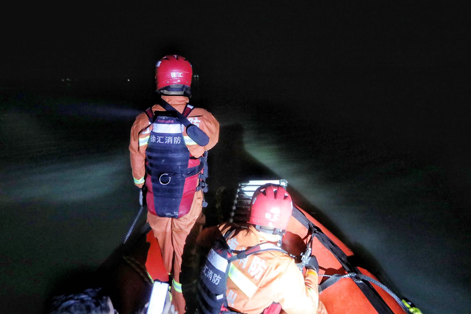 晚上6时30分,消防救援指战员完成所有准备工作。由于镇内公路都已被洪水淹没,运输车辆无法将搜救艇运往村庄附近,只能在较远的被水淹没的公路附近放艇。放艇前,排除水中电线、路边围栏等主要潜在危险,随着夜色四合,消防指战员乘坐冲锋艇,在手持光源的照射下,4组8艘救援艇依次从无为市040县道向受灾区域前进。