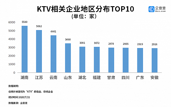 随着北京市文旅局宣布KTV、剧场、网吧等有序恢复开放,全国休闲娱乐场所也即将进入全面开放的轨道。作为消费密集型行业的典型代表,KTV行业近三个月已逐步复苏。企查查数据显示,我国目前共有6.3万家KTV相关企业,2019全年注册量为1.1万家,今年上半年新注册3206家,同比下跌了35.9%。从地区分布方面看,湖南省拥有的KTV相关企业数量最多,达到5580家,江苏、云南分别以5062家、4441家分列二三位。