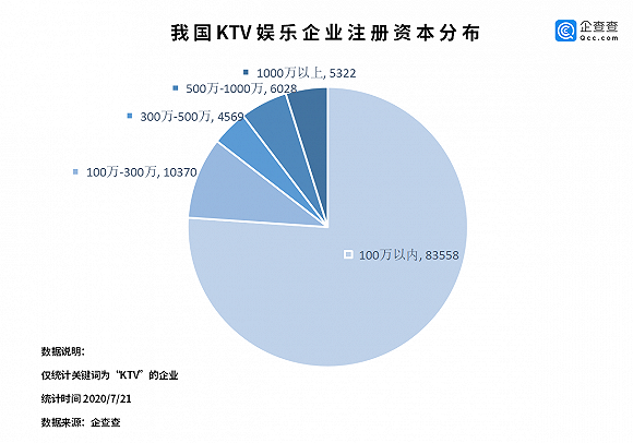 从注册资本分布来看,有8.3万线下KTV相关企业注册资本在100万以内,占比84.7%,注册资本在300万-500万的企业数量最少,只有4569家。