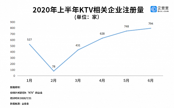 2020年上半年,我国KTV相关的企业共新注册了3206家,同比下跌了35.9%,受到疫情的影响比较明显。其中二月份是新增量进入最低谷,仅有76家,随后3云粉开始恢复增长,6月份新增企业已达794家。同时,上半年相关企业注吊销量也达到了964家。
