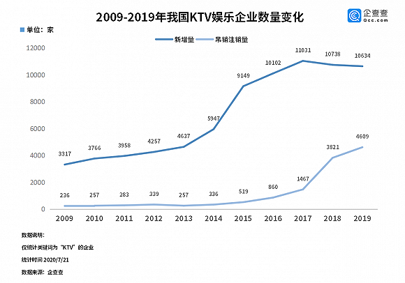 与此同时,KTV相关企业的年注销、吊销量也持续走高。企查查数据显示,2009年开始,注吊销数据逐年增加,2019年达到最高的4609家。