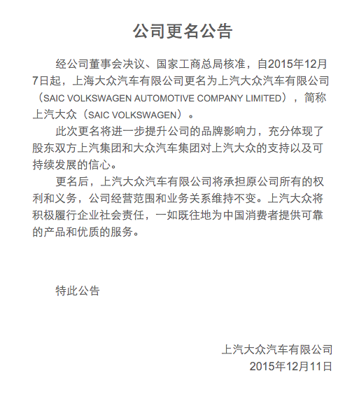 12月11日,上海大众汽车有限公司官网发布公告称,该公司自今年12月7日起,正式更名为上汽大众汽车有限公司(SAIC VOLKSWAGEN AUTOMOTIVE COMPANY LIMITED),简称上汽大众(SAIC VOLKSWAGEN)。