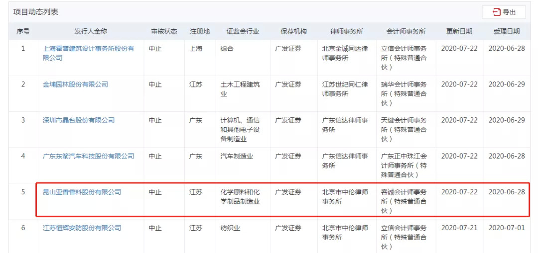 广发证券被证监会处罚暂停保荐机构资格6个月的影响正在持续扩散。根据深交所官网,目前由广发证券保荐的6家企业审核状态在近期更新为中止,其中就包括奇华顿、芬美意等国际香精香料公司的供应商昆山亚香香料股份有限公司(下称亚香香料)。