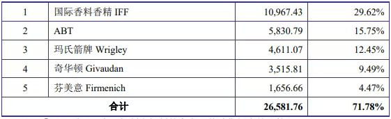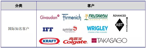 客户包括国际香料香精(IFF)、奇华顿、芬美意、德之馨、花臣等全球前十大香精香料公司,以及高露洁、薇美姿(舒客、舒客宝贝、舒贝齿、舒倍健4大口腔护理品牌的母公司)等国内外快消品公司。