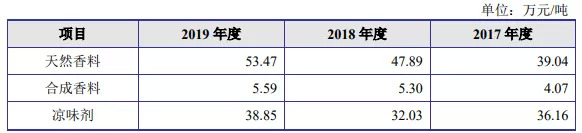招股书数据显示,目前亚香香料拥有天然香料产品逾90种,2017年-2019年天然香料销售价格分别为39.04万元/吨、47.89万元/吨、53.47万元/吨,呈逐年增长状态,且近3年价格增长了36.96%。