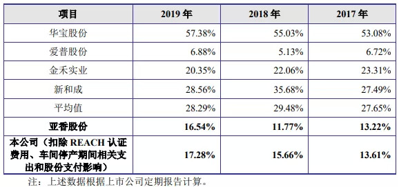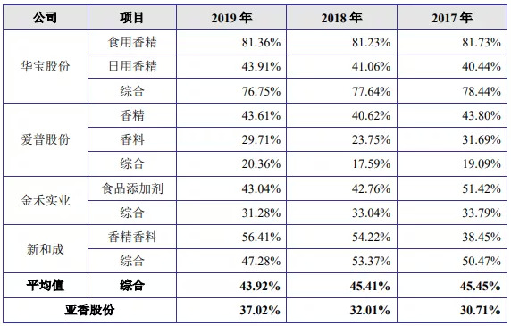 招股书数据显示,与华宝股份、爱普股份等同行业上市公司比较而言,亚香香料近3年的毛利率30.71%、32.01%、37.02%要低于行业平均值45.45%、45.41%、43.92%。