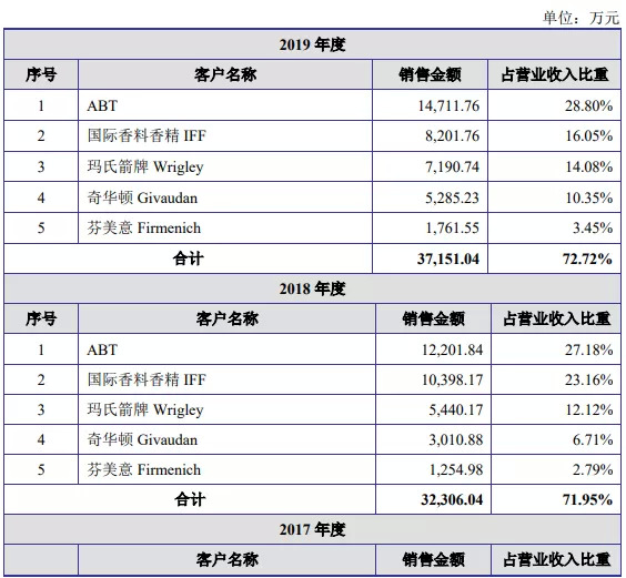除此之外,客户集中度过高也是亚香香料要面临的一大风险。招股书显示,亚香香料向ABT香料香精贸易商、IFF、玛氏箭牌、奇华顿和芬美意这五大客户销售额合计占公司当期营业收入的比例分别为71.78%、71.95%和72.72%。若这些主要客户生产经营状况发生重大不利变化或未来发展计划发生变化,需求下降,或因为在产品品质、及时交付以及持续竞争力等方面出现问题,导致主要客户转向其他供应商采购相关产品,将给其生产经营带来一定的不利影响。