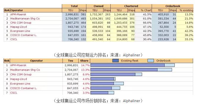 航运界网解析:航运界网查询航运咨询机构Alphaliner截至12月11日的最新数据(如下图所示),“中远集运”共拥有控制运力161艘、847,055TEU;订单22艘、332,003TEU;占全球市场份额的4.2%,排名世界第六。“中海集运”共拥有控制运力132艘、706,340TEU;订单14艘、233,928TEU;占全球市场份额的3.5%,排名世界第七。二者整合后,控制运力总规模将达到293艘、155.3万TEU;订单36艘、56.6万TEU;占全球运力规模的7.8%,超越德国赫伯罗特公司位居世界第四位,并大幅缩小与世界前三大班运公司的差距。
