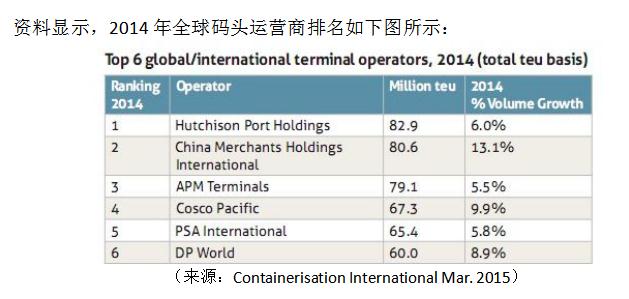 由图可知,2014年“中远太平洋”吞吐量达6770万TEU,排名世界第四。经过重组,凭借中海码头资产,“中远太平洋”的码头网络将得到显著扩张,全球集装箱码头数量将达到42个,将覆盖国内全部沿海省份和海外主要枢纽港。