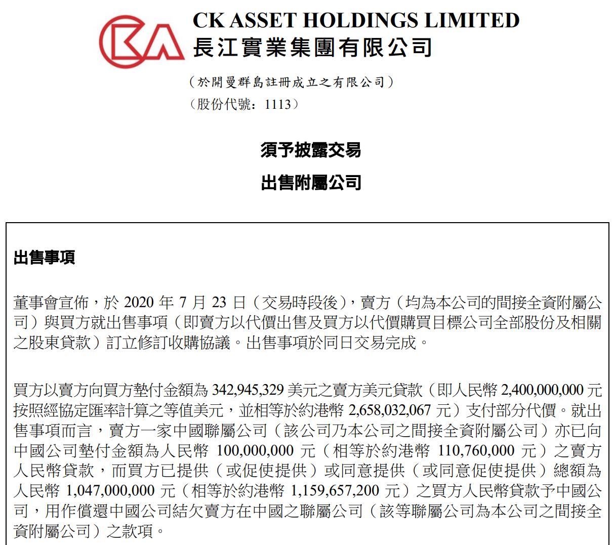 7月23日晚,李嘉诚旗下公司长实集团发布了一则公告。