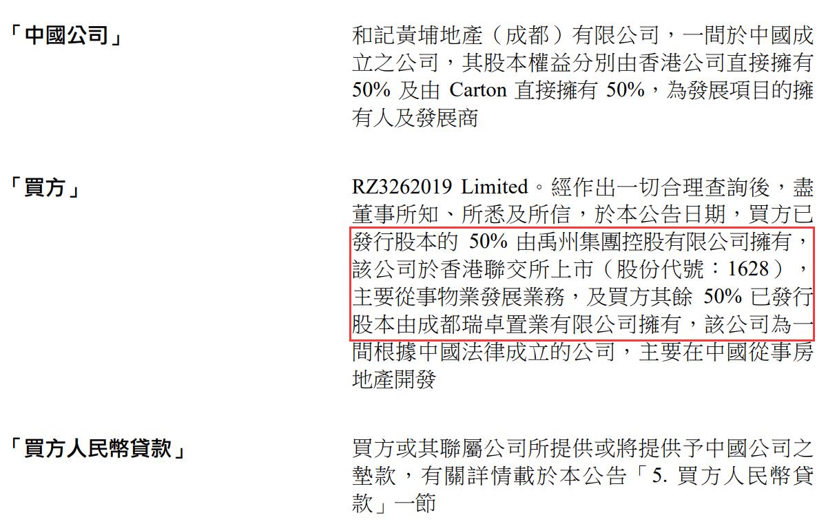 公告称,由长实集团子公司所持有的成都南城都汇项目卖了,接盘方为一家名为RZ3262019 Limited的公司,股东分别为禹州集团控股有限公司和成都瑞卓置业有限公司,各占股50%。