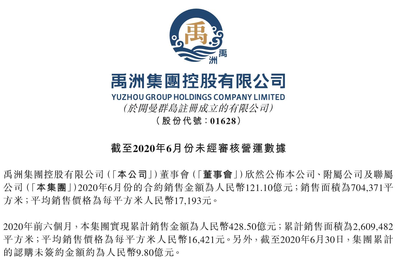 7月早些时候,禹洲集团公布了2020上半年未经审核的营运数据,2020年前六个月,该集团实现累计销售金额为人民币428.50亿元;累计销售面积为2,609,482平方米;平均销售价格为每平方米16,421元。