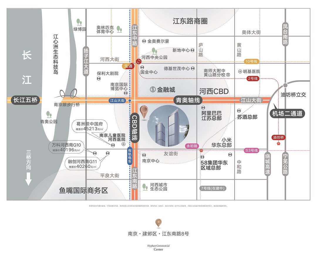 江山大街与江东南路交汇,坐享CBD三期与青奥轴线的黄金十字路网接驳全城,四轨地铁链接,这是对伟大速度的掌控自如;背靠金融城,紧邻阿里巴巴、小米科技、京东、58集团、苏酒等总部巨头,这是资本竞逐的伟大圈层。