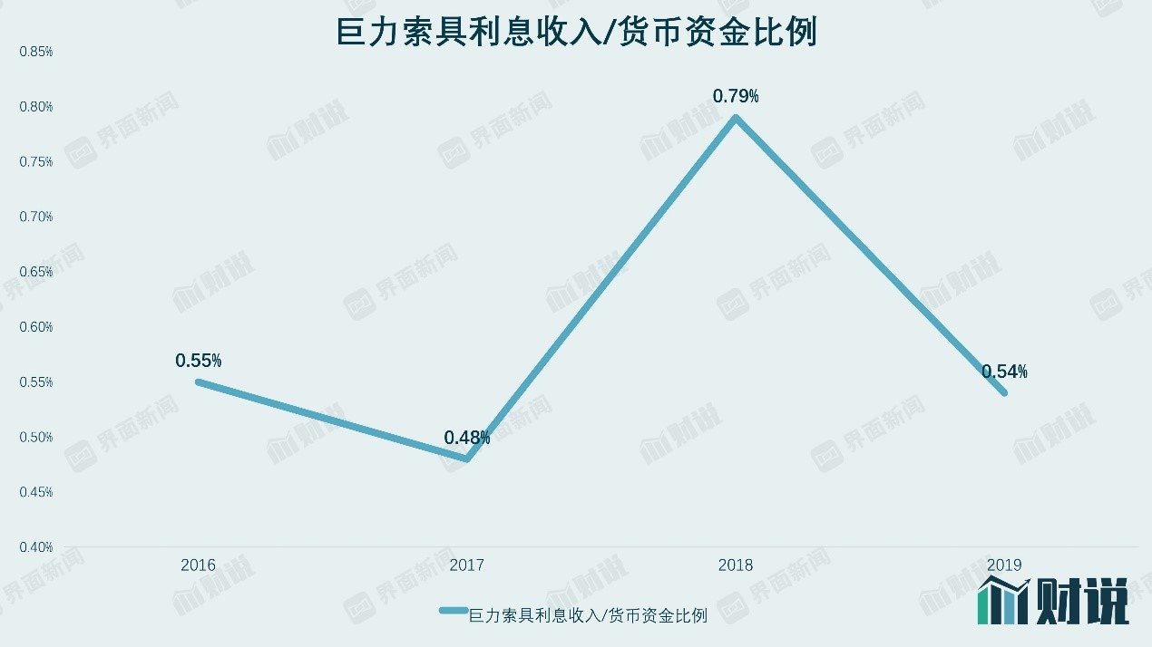 数据显示,2019年巨力索具货币资金为4.87亿元,利息收入仅为0.03亿元,对应利率仅为0.54%,显著低于公开市场正常利率。一般而言,公司利息收入主要由两部分组成:银行存款利息和委托贷款利息。前者利率较低,账面货币资金大部分为活期存款或七天通知存款;后者利率较高,系公司在合作项目上按照合作协议约定进行收取。无论如何,巨力索具的利息收入都显著低于市场利率。