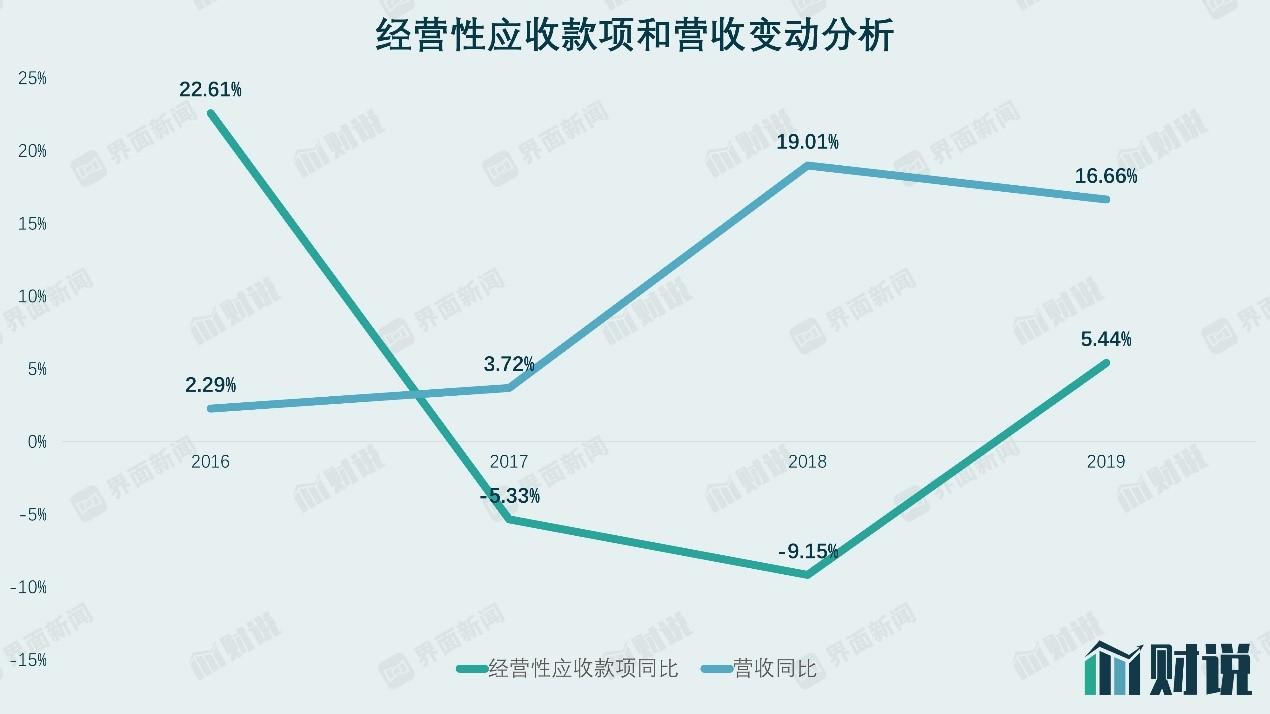 巨力索具“平衡”坏账损失背后,还做了应收账款的“再平衡”。公司的经营性应收款项和和营收变动呈现背离状态。一般而言,经营性应收款项会随着营收的增长而增长,两者呈现正向关系。近几年,巨力索具主营业务发展较为稳定,并没有大的变动。然而2018年公司营收同比增长19.01%,与此同时其经营性营收款项却同比下滑9.15%;而到了2019年,公司经营性营收款项增幅却又回归正轨。