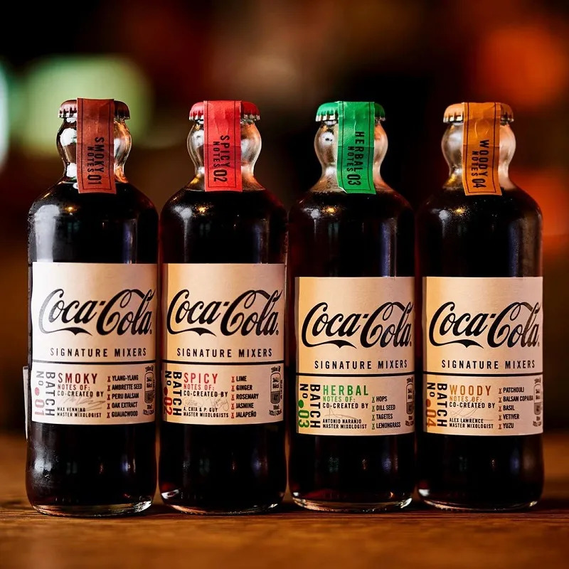 不仅国内,2019年6月,一直以来滴酒不沾的可口可乐,竟然在英国推出了Signature Mixers系列,是首款混合了威士忌等高度酒的可乐。可口可乐此次进军含酒精饮料,不仅邀请世界顶级调酒师调制产品,还别出心裁地采用了玻璃瓶包装,向百年前第一支哈坎森玻璃瓶可口可乐致敬。