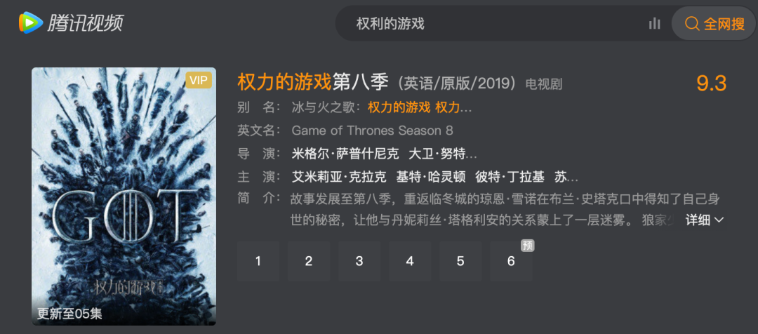 即便是现在去腾讯视频上搜索《权力的游戏》最终季,也会看到本季仅有前五集可供观看,最终大结局由于“技术原因”时隔一年多也终未上线。更不提即便是已经上线的那些集数,每集也都是或多或少有不同程度的删减,不论是删减还是这种不可名状的意外,都很难说服忠实剧迷再为其买单。