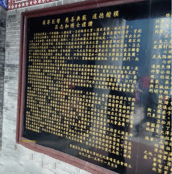 重建的“吕氏宗祠”内,族人在吕氏简谱石碑的旁边,立了“吕志和博士礼赞”,专门记刻了吕志和的在商界、慈善界的事迹,也表彰他即使多年来远离故土,始终不改对家乡的赤子之心。■