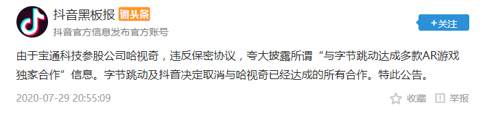 7月29日晚间,抖音官方头条号“抖音黑板报”发布消息称,由于宝通科技参股公司哈视奇违反保密协议,夸大披露所谓“与字节跳动达成多款AR游戏独家合作”信息。字节跳动及抖音决定取消与哈视奇达成的所有合作。