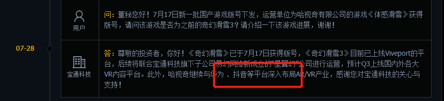 不仅如此,7月28日午间,董秘在回复一则与抖音并无关系的游戏版号相关问题时,在结尾处加上了“哈视奇继续与华为、抖音等平台深入布局VR/VR产业”的描叙,颇有几分“插入广告”的意味。