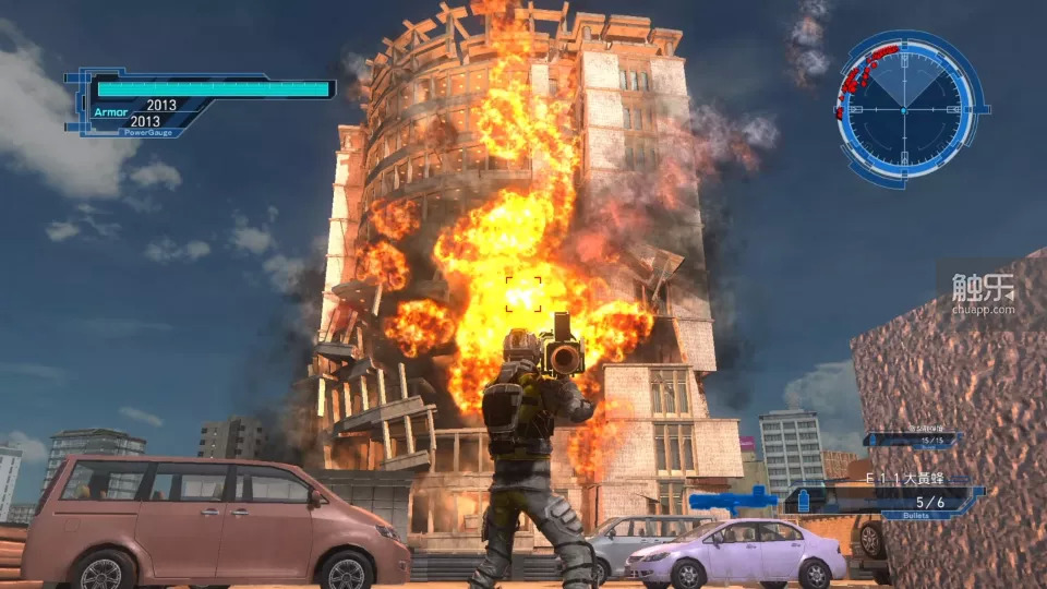 游戏的物理引擎比较夸张,玩家可以轻易将敌人炸飞数十米之远。把群聚而来的敌人用一发火箭炮送走,旁边的建筑也跟着轰然倒塌,既有成就感,也满足了发泄欲。
