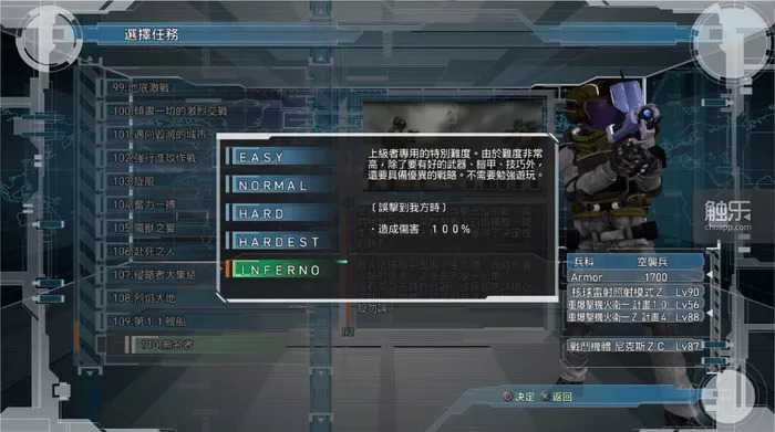 游戏“丧心病狂”地准备了5个难度,玩家第一次通关时只能最多玩到前3个难度。二周目解锁的Hardest和Inferno难度中,敌人数值会大幅度提升,还会出现新的强力敌人(比较厚道的是,这些敌人第一次出现时会触发新的对话),当然,玩家也会获取更高级的武器,其中有些可以提供完全不同的战术思路。因此,多周目的游玩内容是十分丰富的。