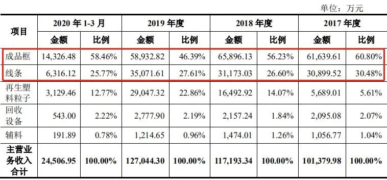 因此,公司主要产品包括成品框、线条、再生塑料粒子、回收设备及辅料等五类产品。